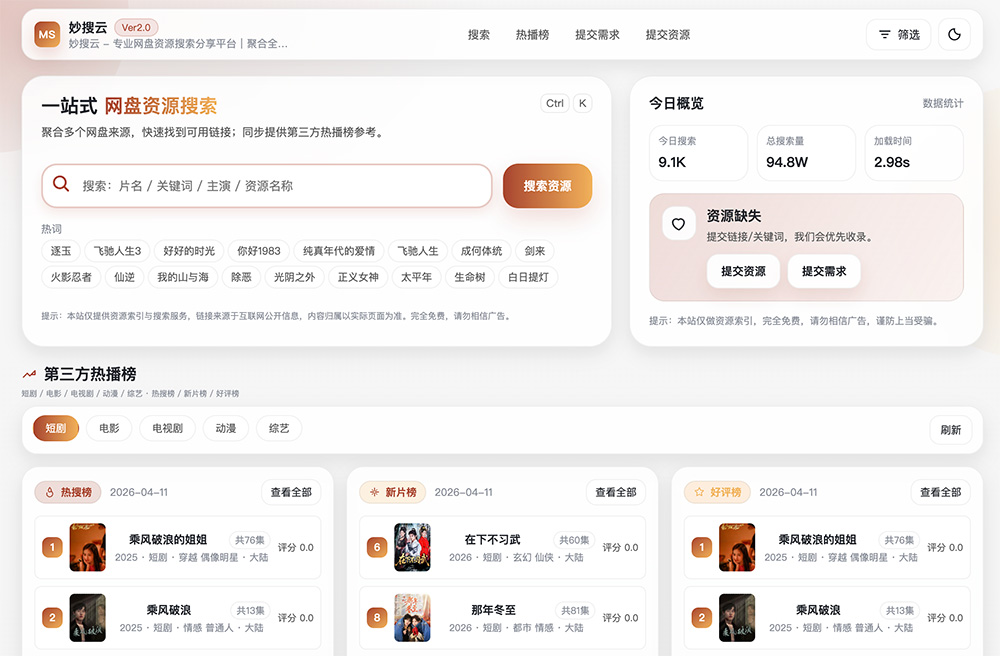 妙搜云是一款支持国内主流网盘的资源搜索引擎,主打影视类资源搜索,涵盖短剧、电影、剧集、综艺、动漫等多个品类。搜索结果支持夸克网盘、百度网盘、迅雷云盘、UC网盘、天翼云盘、蓝奏云、115等多种网盘,实测资源主要集中在夸克、百度、迅雷三大平台,并非全部资源都能匹配所有网盘。
